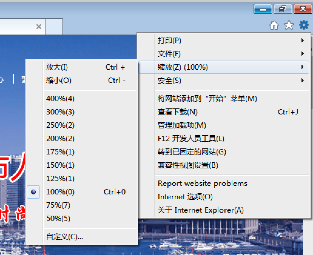 瀏覽器縮放設置,以IE瀏覽器為例進行說明:點擊瀏覽器“工具”菜單->縮放,推薦使用100%。