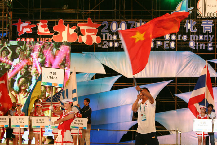 楊樹安致開幕辭。他說,今天我們高興地迎來了“好運北京”2007中國石化青島國際帆船賽的開幕。我謹(jǐn)代表好運北京體育賽事組委會,向比賽的勝利開幕表示熱烈地祝賀!向來自世界各地的運動員、教練員、技術(shù)官員和國際帆聯(lián)來賓表示熱烈地歡迎!向承辦此次比賽的青島市委、市政府和800萬青島市民表示崇高的敬意和衷心地感謝!