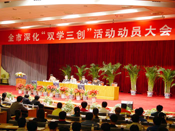 蔡倫斌強調(diào),要明確任務(wù),突出重點,推動“雙學(xué)三創(chuàng)”活動不斷上水平。一是以建設(shè)高素質(zhì)的人才隊伍為目標(biāo),大力營造掌握一流技能、干出一流業(yè)績的濃厚氛圍。在企業(yè),針對當(dāng)前我市勞動力供需結(jié)構(gòu)性矛盾突出和技能人才緊缺的現(xiàn)狀,進(jìn)一步建立完善人才培養(yǎng)、引進(jìn)、使用和管理的各項政策措施,加強業(yè)務(wù)技能培訓(xùn),加快高素質(zhì)技能人才隊伍建設(shè)。在黨政機關(guān),要把提高黨的執(zhí)政能力建設(shè)同先進(jìn)性教育活動、開展基層建設(shè)年工作結(jié)合起來,同深化“五項工程”、創(chuàng)建“四型機關(guān)”、開展“三快一提高”活動結(jié)合起來,突出處室建設(shè),深入開展“創(chuàng)建高績效機關(guān)、爭做人民滿意公務(wù)員”活動。在農(nóng)村,要加強對農(nóng)民的思想道德教育,加強科技培訓(xùn),引導(dǎo)農(nóng)民轉(zhuǎn)變思想觀念和經(jīng)營理念,提高科技致富能力,培養(yǎng)一批“種糧能手”、“果樹能手”、“蔬菜能手”和“養(yǎng)殖能手”,推動農(nóng)村產(chǎn)業(yè)結(jié)構(gòu)調(diào)整,實現(xiàn)農(nóng)民的增收致富。在城市社區(qū),要著眼于建設(shè)平安、和諧、文明和富有特色的社區(qū),加強對社區(qū)管理人員、服務(wù)人員的思想道德和業(yè)務(wù)能力教育,提高他們的服務(wù)意識和水平。二是以實現(xiàn)由品牌企業(yè)、品牌經(jīng)濟(jì)向品牌城市的跨越為目標(biāo),大力營造打造一流團(tuán)隊、創(chuàng)建一流品牌的濃厚氛圍。企業(yè)在創(chuàng)建品牌活動中具有特殊重要的地位,企業(yè)創(chuàng)品牌的最根本目的是推動發(fā)展,在品牌創(chuàng)建工作中,企業(yè)應(yīng)為全市作出表率。各級黨政機關(guān)既擔(dān)負(fù)著為各行各業(yè)創(chuàng)品牌營造良好社會環(huán)境的職責(zé),又承擔(dān)著帶頭創(chuàng)建政務(wù)品牌的責(zé)任,是創(chuàng)建品牌工作的重要環(huán)節(jié),黨政機關(guān)創(chuàng)品牌的最終目的是創(chuàng)建高績效機關(guān),推動全市經(jīng)濟(jì)社會協(xié)調(diào)健康發(fā)展。農(nóng)業(yè)和農(nóng)產(chǎn)品品牌的創(chuàng)建是品牌創(chuàng)建的薄弱環(huán)節(jié),需下大力氣培育,關(guān)鍵是推動農(nóng)村產(chǎn)業(yè)結(jié)構(gòu)調(diào)整,促進(jìn)“三農(nóng)”問題的解決,促進(jìn)農(nóng)民增收致富。三是以增強城市核心競爭力為目標(biāo),大力營造樹一流作風(fēng)、創(chuàng)一流環(huán)境的濃厚氛圍。當(dāng)前,我市創(chuàng)建一流社會環(huán)境,重點是抓好創(chuàng)建全國文明城市、生態(tài)市和迎接2008年奧帆賽三個環(huán)節(jié)。要以“雙學(xué)三創(chuàng)”活動為載體,動員全市干部群眾積極投身到創(chuàng)城活動中來,大力提升城市文明程度,推進(jìn)社會信用體系、社會保障體系和生態(tài)環(huán)境建設(shè),努力提升城市核心競爭力,以良好的服務(wù)環(huán)境、政治環(huán)境、政策環(huán)境和社會環(huán)境,力爭使青島首批進(jìn)入全國文明城市行列。