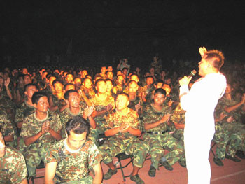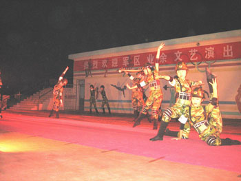8月14日晚上,膠南市靈山衛(wèi)中學(xué)體育場(chǎng)內(nèi)燈火通明,熱鬧非凡。濟(jì)南軍區(qū)業(yè)余文藝演出隊(duì)舉行露天文藝演出,慰問在此海訓(xùn)的某集團(tuán)軍工兵團(tuán)官兵和支持部隊(duì)海訓(xùn)的駐地群眾,演繹了官兵同樂、軍政軍民魚水情深的新樂章。