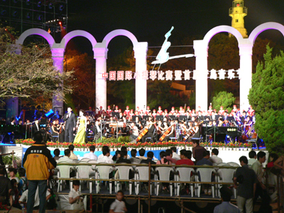 音樂會以肖斯塔科維奇為紀(jì)念俄國十月革命37周年所做的《節(jié)日序曲》開場,背延山勢、面朝大海的舞臺上,氣勢恢弘的旋律與相伴而起的禮花在音樂會之初就將小青島的氣氛引向高潮,接下來約翰·施特勞斯的一曲《嘰嘰喳喳波爾卡》也沒有讓觀眾得到片刻的喘息,明快跳躍的節(jié)拍與清脆悅耳的童音依舊令觀眾的情緒振奮不已,好在德國銅管五重奏臨時(shí)將維瓦爾蒂的《四季———春》臨時(shí)改為一首描寫兩個(gè)醉酒朋友的略顯慵懶的華爾茲,終于可以令人們激越的心暫且平靜一會兒,但接下來美國雙鋼琴演奏家以絕對的默契奏響的攝人心魄的鋼琴協(xié)奏曲《黃河》第四樂章,呂思清所奏的《流浪者之歌》的回腸蕩氣,遂使現(xiàn)場出現(xiàn)了第二次高潮。據(jù)悉這也是呂思清與青島交響樂團(tuán)的首度合作。樂閉,呂思清對于樂團(tuán)的現(xiàn)場表現(xiàn)十分滿意,他表示這是一支年輕而又充滿活力的樂隊(duì),他對它的未來充滿信心。來自上海的青島交響樂團(tuán)首席客座指揮張國勇同樣給予了這支新組建的樂團(tuán)充分的肯定。他說,在國內(nèi)很少有職業(yè)交響樂團(tuán)的演奏者像這支樂團(tuán)的成員一樣,在演奏中永遠(yuǎn)保持投入的態(tài)度,并擁有如此強(qiáng)烈的表演激情,這是一個(gè)好的表征,也是一個(gè)好的起點(diǎn)。