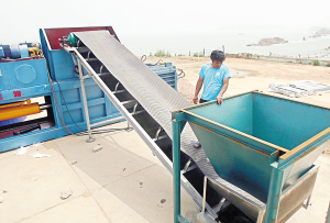 工作人員維護(hù)滸苔壓榨脫水打包機(jī)。安置在海洋游樂(lè)城處兩臺(tái)滸苔壓榨脫水打包機(jī)已經(jīng)調(diào)試完畢,隨時(shí)可以投入使用。滸苔壓榨脫水打包機(jī)是為解決滸苔難于運(yùn)輸和處理而專門研發(fā)的,每10分鐘可處理載重20噸滸苔,整個(gè)過(guò)程全部是機(jī)械操作,一臺(tái)機(jī)器一天就可處理滸苔上千噸。