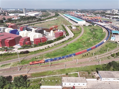 在上合示范區(qū)多式聯(lián)運(yùn)中心,一條條鋼軌交錯(cuò)著伸向遠(yuǎn)方,貨場(chǎng)內(nèi)巨大的龍門(mén)塔吊正在忙碌地裝運(yùn)各種集裝箱,“中國(guó)制造”“青島制造”從這里啟程快速進(jìn)入全球市場(chǎng);哈薩克斯坦小麥粉等“上合好物”也在這里集散流通進(jìn)入中國(guó)。
