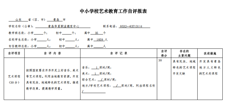 青島華夏職業(yè)學(xué)校2025年中小學(xué)校藝教育工作自評(píng)報(bào)表