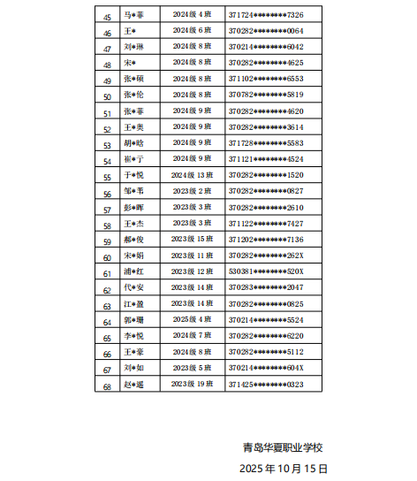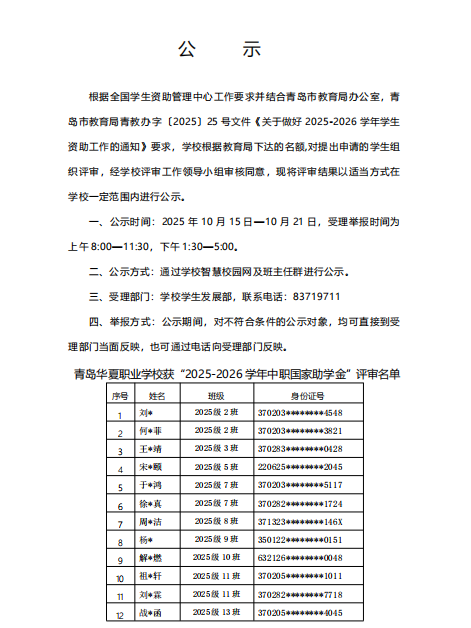 青島華夏職業(yè)學(xué)校2025年中職國(guó)家助學(xué)金公示