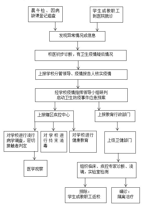 3.?及時上報與結果追蹤。建立衛(wèi)生防疫事件報告管理制度,實行責任制。本著“先控制、后處置、救人第一、減少損失”及“早發(fā)現(xiàn)、早報告、早控制、早治療、早處理”的原則,果斷處置,積極處置。學校指定專人作為疫情報告人,負責具體報告工作。建立由學生到教師、到學校疫情報告人、到學校領導的疫情發(fā)現(xiàn)、信息登記與報告流程。