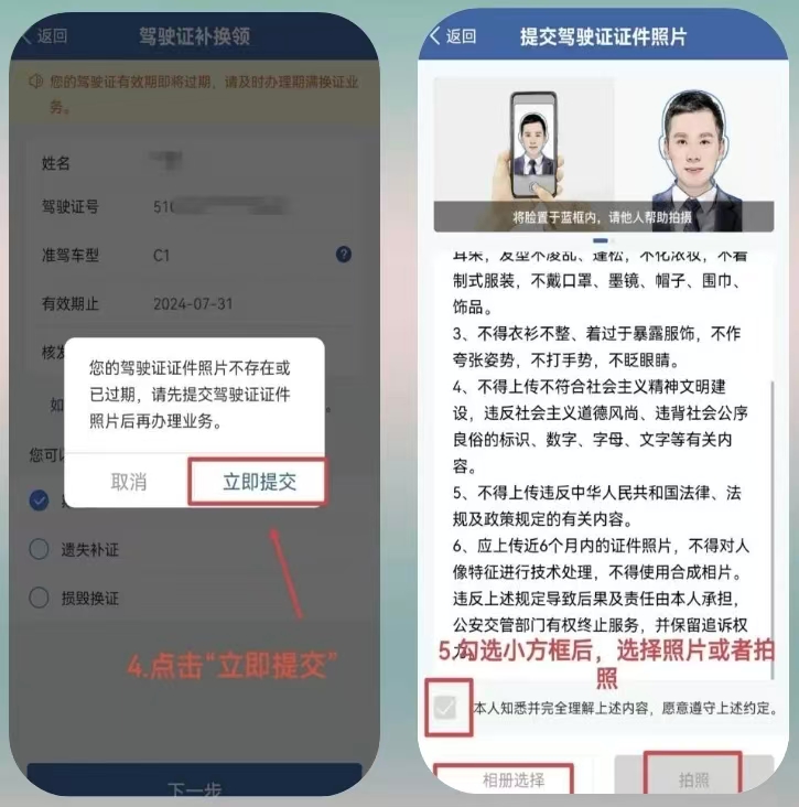 2.提交材料:上傳您的駕駛證照片(可以是之前上傳的或現(xiàn)場拍攝的),并確認(rèn)體檢信息。