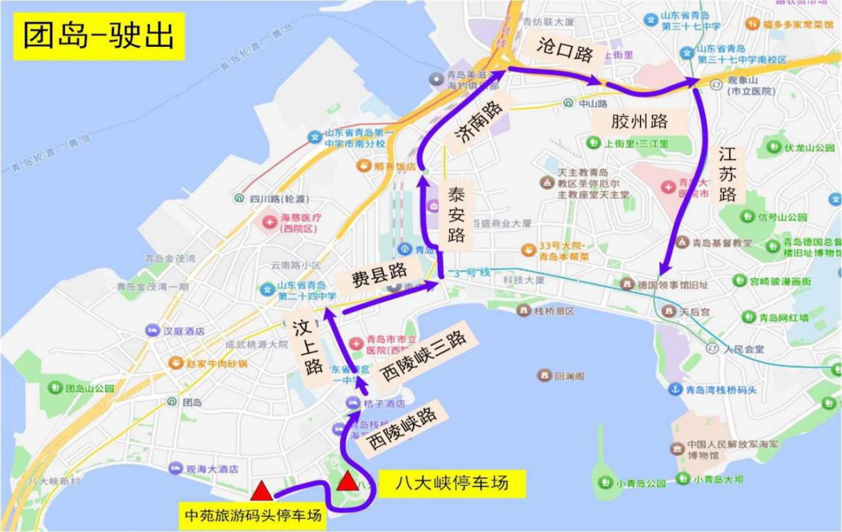 駛出1:停車場(chǎng)→常州路→廣西路→泰安路→費(fèi)縣路→團(tuán)島方向