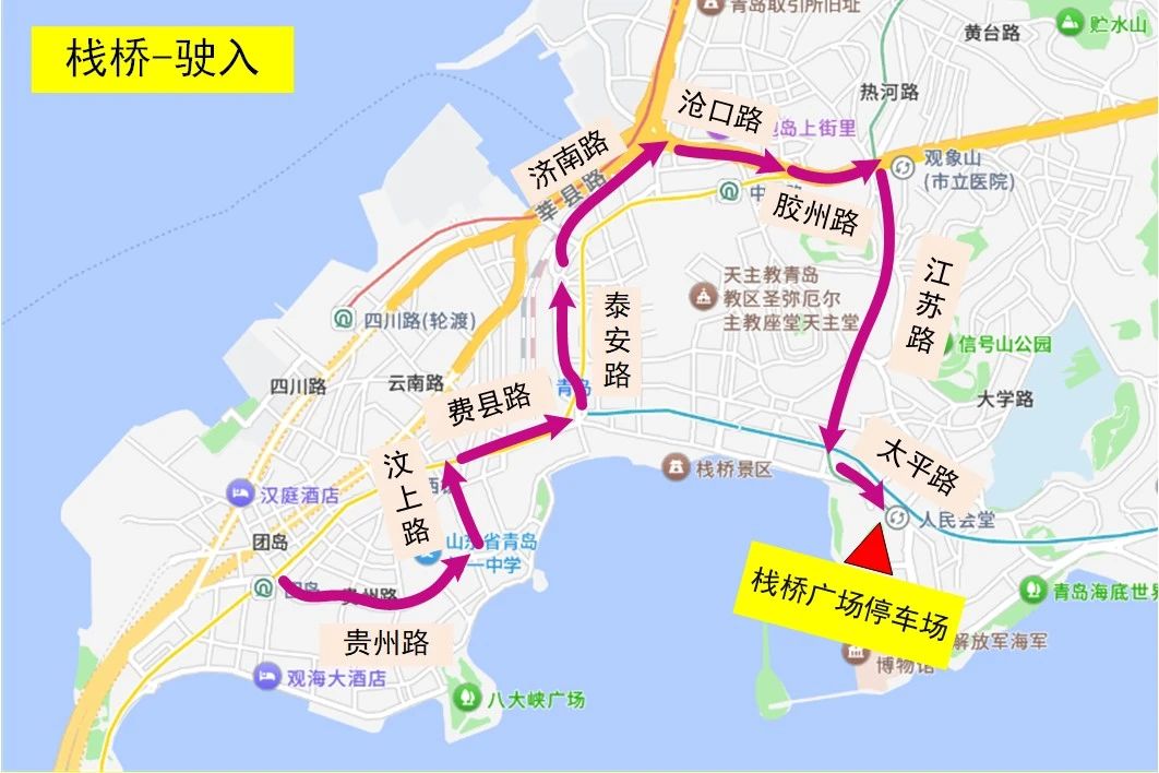 駛?cè)耄嘿F州路→汶上路→費(fèi)縣路→泰安路→濟(jì)南路→滄口路→膠州路→江蘇路→太平路→停車場(chǎng)