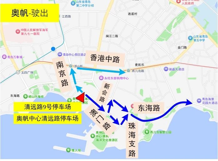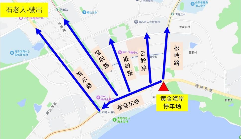 駛出:黃金海岸停車場(chǎng)→香港東路→海爾路/深圳路/松嶺路/秦嶺路/云嶺路