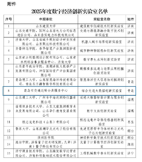 ? ? ? ? 近期,山東省工業(yè)和信息化廳公布了2025年度山東省數(shù)字經(jīng)濟創(chuàng)新平臺名單。經(jīng)過單位申報、行業(yè)主管部門推薦、專家評審、網(wǎng)上公示等嚴(yán)格程序,由青島市交通運輸公共服務(wù)中心牽頭組建的“綜合交通大數(shù)據(jù)創(chuàng)新實驗室”成功入選,獲批成為“2025年度數(shù)字經(jīng)濟創(chuàng)新實驗室”。