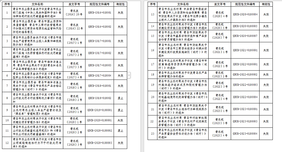 青島市農(nóng)業(yè)農(nóng)村局失效和廢止部門行政規(guī)范性文件目錄