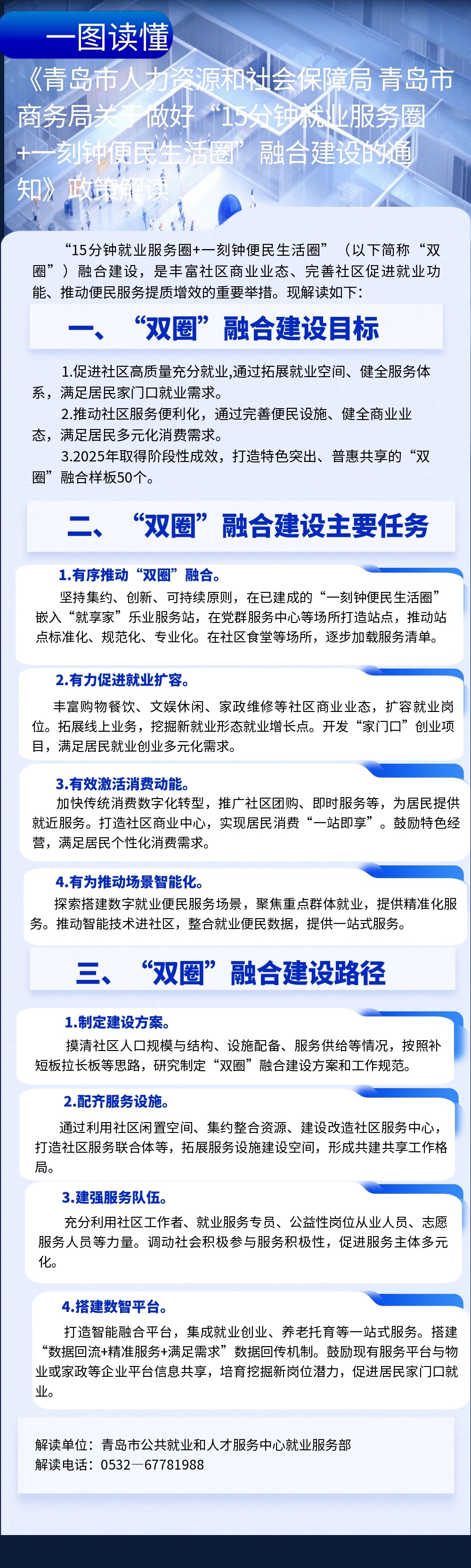 【圖片解讀】《青島市人力資源和社會保障局 青島市商務(wù)局關(guān)于做好“15分鐘就業(yè)服務(wù)圈+一刻鐘便民生活圈”融合建設(shè)的通知》政策解讀
