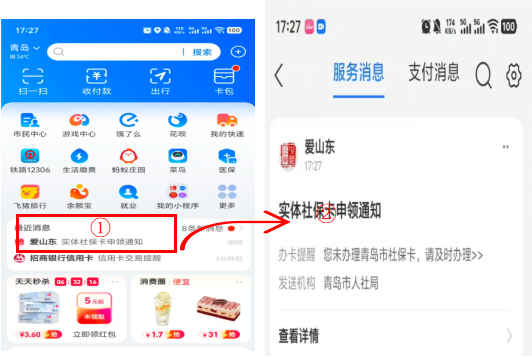 為提醒市民及時辦卡,近期,青島市人力資源和社會保障局將通過“支付寶”APP,為已在青島市參加社會保險還未申領(lǐng)社??ǖ膮⒈H耍扑汀皩嶓w社??ㄉ觐I(lǐng)通知”的提醒消息。市民在收到由青島市人社局推送的“您未辦理青島市社???,請及時辦理”的信息后,可直接點擊該提醒消息,系統(tǒng)將自動跳轉(zhuǎn)到“愛山東”政務(wù)服務(wù)平臺→社會保障卡申領(lǐng)(成年人)頁面,市民可按照頁面指引辦理個人社??ㄉ觐I(lǐng),選擇“郵寄發(fā)卡”,受理銀行受理申請后,符合制卡條件的進行制卡并免費寄遞到家。