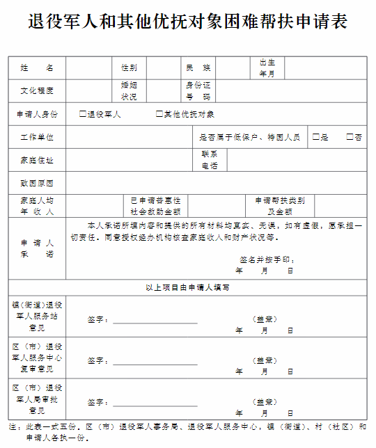 本人向戶籍所在地鎮(zhèn)(街道)退役軍人服務(wù)站申請,填寫《退役軍人和其他優(yōu)撫對象困難幫扶申請表》,提供申請證明材料。申請人提供的申請材料不全或者不符合要求的,鎮(zhèn)(街道)退役軍人服務(wù)站應(yīng)當(dāng)一次性告知所缺材料。