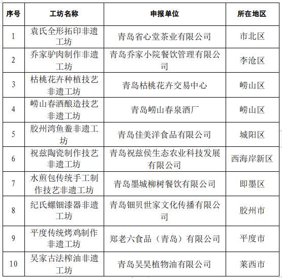 為進一步推進青島市非遺事業(yè)發(fā)展,根據文化和旅游部辦公廳、人力資源社會保障部辦公廳、國家鄉(xiāng)村振興局綜合司《關于持續(xù)推動非遺工坊建設助力鄉(xiāng)村振興的通知》(辦非遺發(fā)〔2021〕221號)精神和《山東省非遺工坊認定和管理辦法》的有關要求,青島市文化和旅游局會同市人力資源和社會保障局、市農業(yè)農村局開展了青島市第三批市級非遺工坊評審認定工作。經申報、推薦、評審、公示,最終認定袁氏全形拓印非遺工坊等10家單位為青島市第三批市級非遺工坊,現(xiàn)予公布(具體名單見附件)。