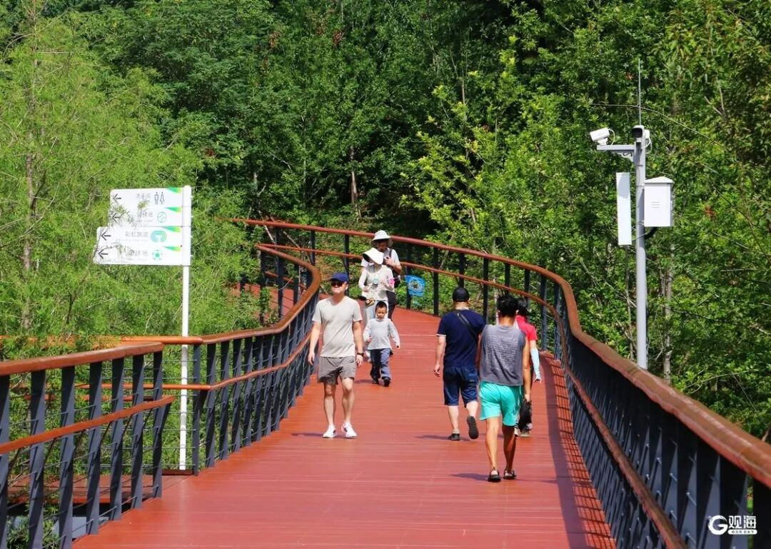 蜿蜒的木棧道依山而建,行人緩步而上,腳下木板輕響,抬頭便是層疊綠蔭;綠道上,有人騎著單車穿梭,衣角被風掀起,笑聲落滿林間;草坪空地上,孩子們嬉鬧奔跑,幾頂帳篷搭在其間,親朋好友們閑談暢聊;不遠處游樂場里,滿是孩子的雀躍呼喊,家長們坐在長椅上,笑著看孩子撒歡。