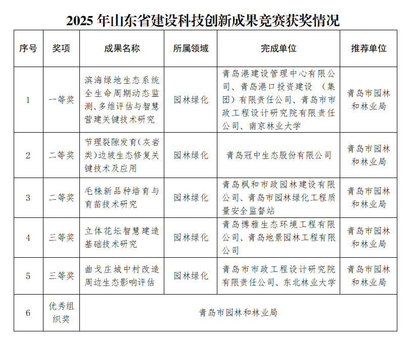 近日,山東省住房和城鄉(xiāng)建設(shè)廳、山東省總工會(huì)聯(lián)合公布了2025年山東省建設(shè)科技創(chuàng)新成果競(jìng)賽結(jié)果,全省累計(jì)427項(xiàng)成果獲獎(jiǎng),我局遴選推薦成果獲獎(jiǎng)5項(xiàng)。其中1項(xiàng)獲一等獎(jiǎng),2項(xiàng)獲二等獎(jiǎng),2項(xiàng)獲三等獎(jiǎng),同時(shí),青島市園林和林業(yè)局榮獲“優(yōu)秀組織獎(jiǎng)”稱號(hào)。
