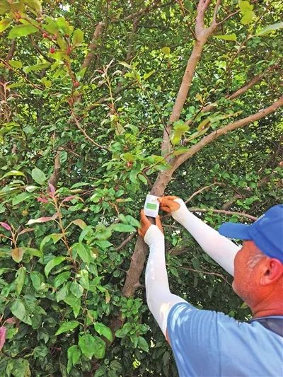 工作人員將裝有柞蠶蛹的紙袋精準(zhǔn)懸掛在樹干向陽處。