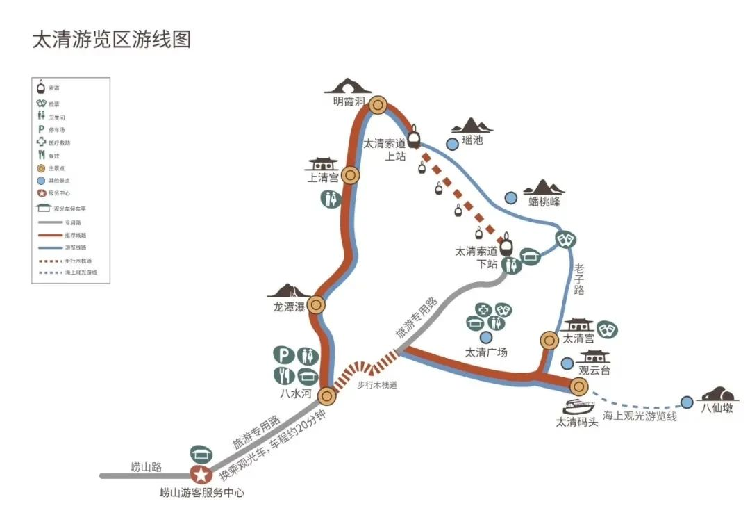 推薦線(xiàn)路②(步行上山):嶗山(大河?xùn)|)游客服務(wù)中心乘坐景區(qū)觀光車(chē)→八水河廣場(chǎng)下車(chē)步行→八水河→龍?zhí)镀佟锨鍖m→明霞洞→太清索道(下行)→沿老子路步行至太清宮(游覽完后在太清廣場(chǎng)乘觀光車(chē))→嶗山(大河?xùn)|)游客服務(wù)中心